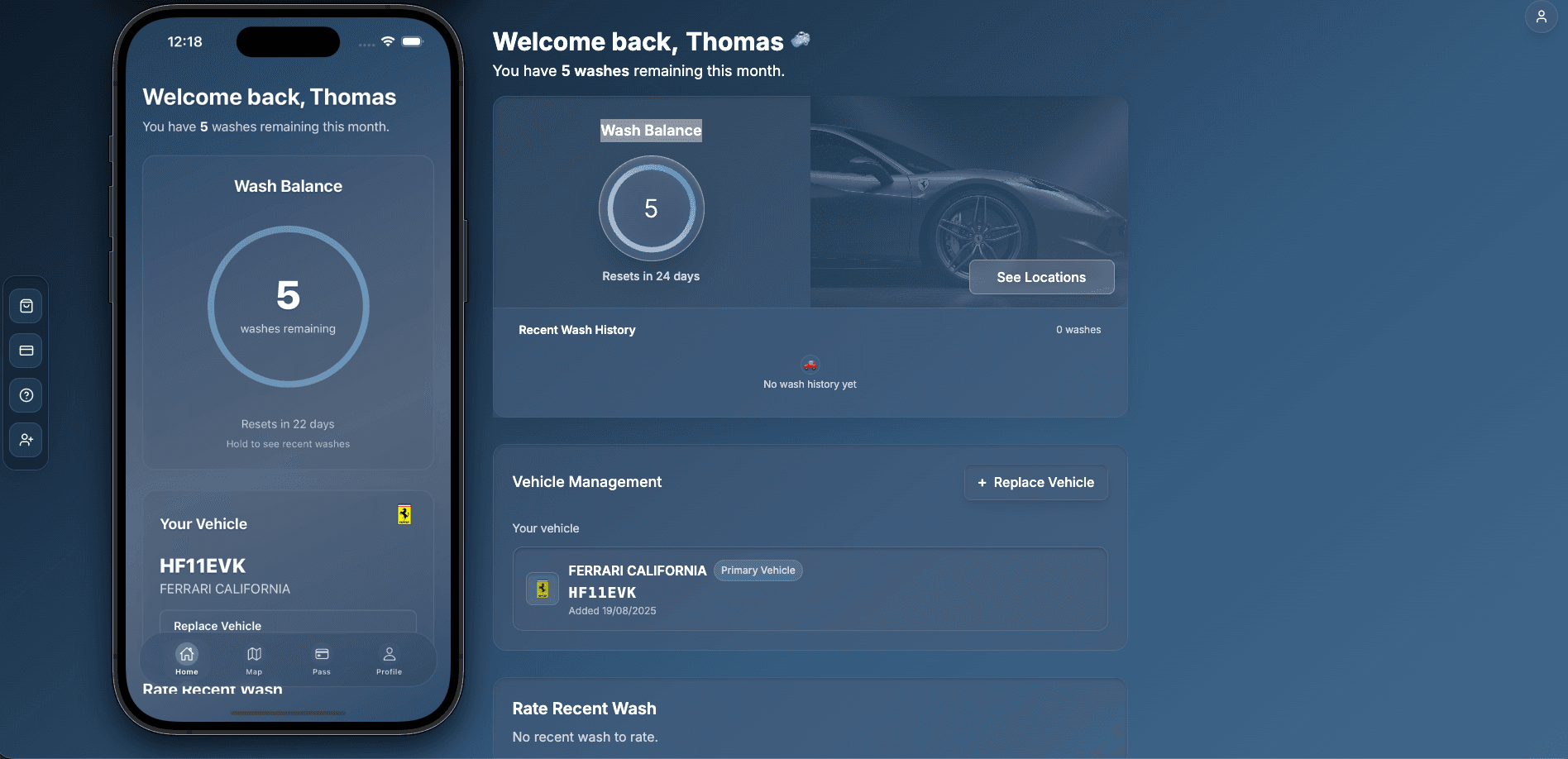 A premium subscription-based car care platform I designed and developed to modernise the car wash industry through a digital-first approach.