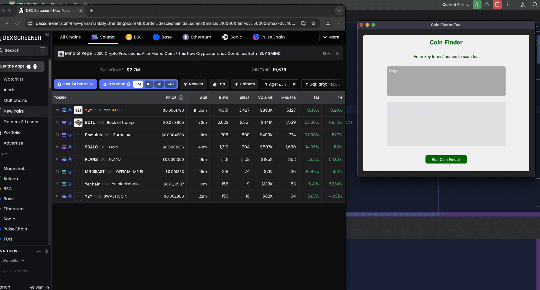 A powerful, real-time tool designed for crypto traders and enthusiasts operating on the Solana blockchain. The system continuously scans and analyses every newly launched Solana token, applying intelligent filters to identify potential high-quality coins early — before the wider market reacts. Key features: